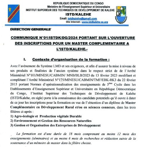 Ce programme du troisième cycle fonctionnera sans faille sous la haute surveillance du Comité de Gestion de l’Istd-Kalehe qui est chapeauté par le Directeur Général, le Professeur Associé Bertin BUZIGIRE MUFANZARA.